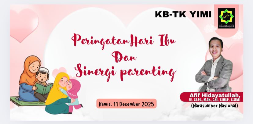 KB-TK YIMI menyelenggarakan kegiatan Peringatan Hari Ibu dan Sinergi Parenting yang berlangsung khidmat dan penuh kehangatan di Aula SD YIMI. Acara ini dilaksanakan pada pukul 08.30–10.30 WIB dan dihadiri oleh seluruh mama KB-TK YIMI yang berjumlah 89 orang, beserta para siswa-siswi dan dewan guru. Kegiatan dipimpin langsung oleh Kepala Sekolah, Ustadzah Kristantin.